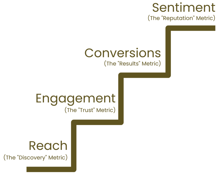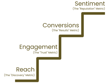 This is a basic ladder of how social media works to tell people about your business (Reach), get them to want what you offer (Engagement), complete the action or purchase (Conversions), and continue as a faithful customer to your business (Sentiment).